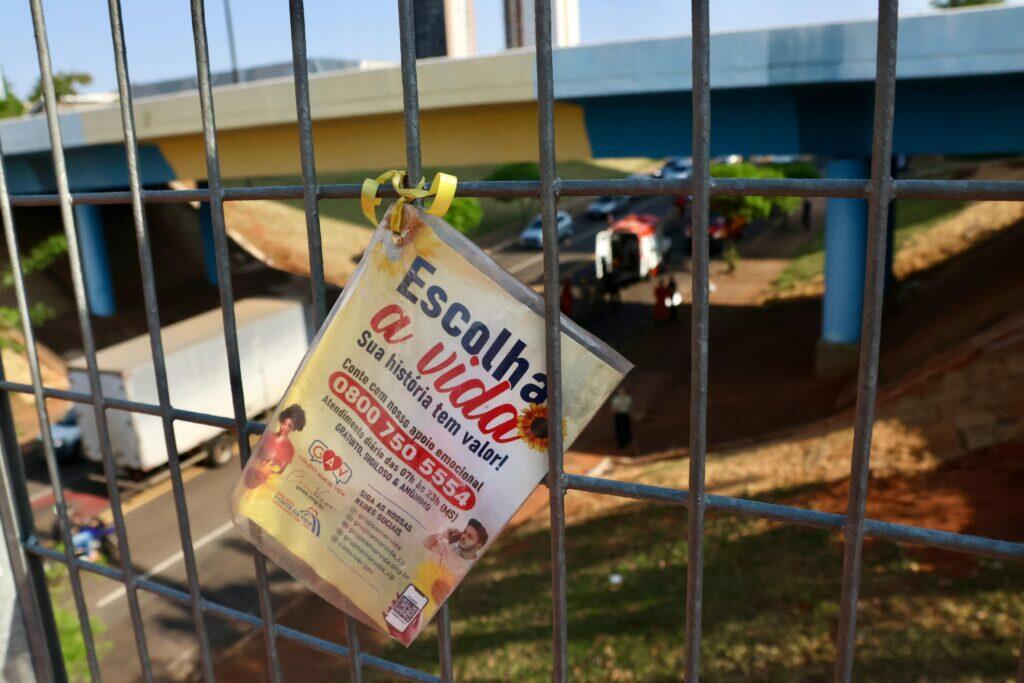 Mensagem de combate ao suicídio fixada em grade do viaduto (Foto: Eliel Dias, Midiamax)