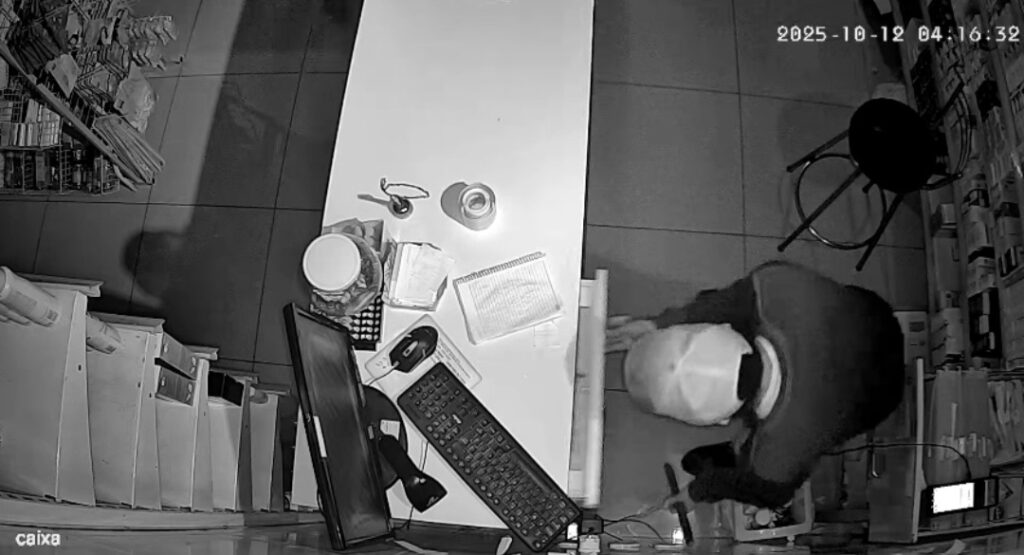 Um deles chegou a arrombar a tranca inferior da porta de vidro, enquanto o outro, de bicicleta, ficou dando cobertura.