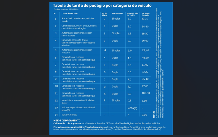 Tabela com as novas tarifas de pedágio: