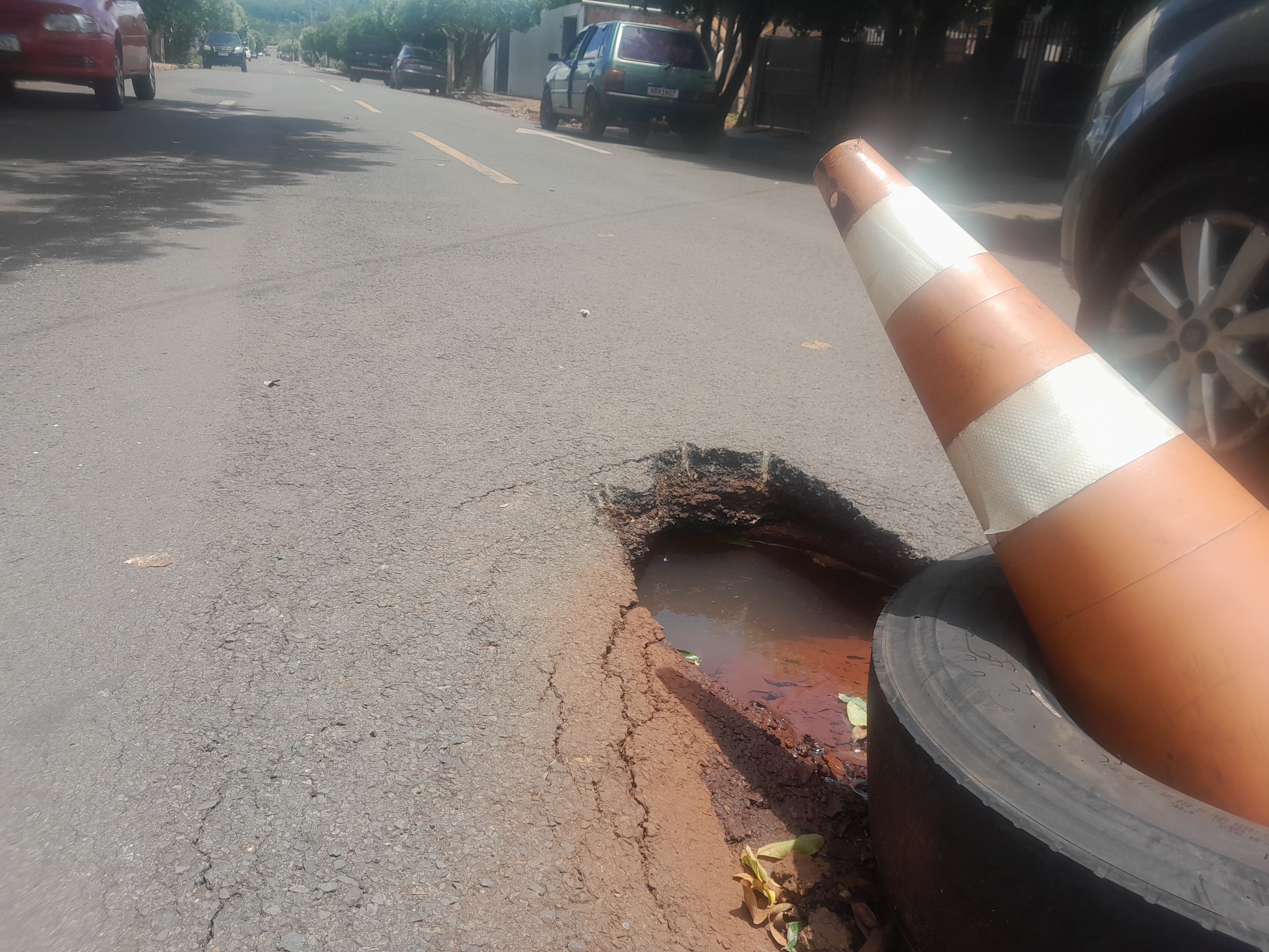 Para evitar acidente, o comerciante Marco Aurélio sinalizou o local com pneu e cone.