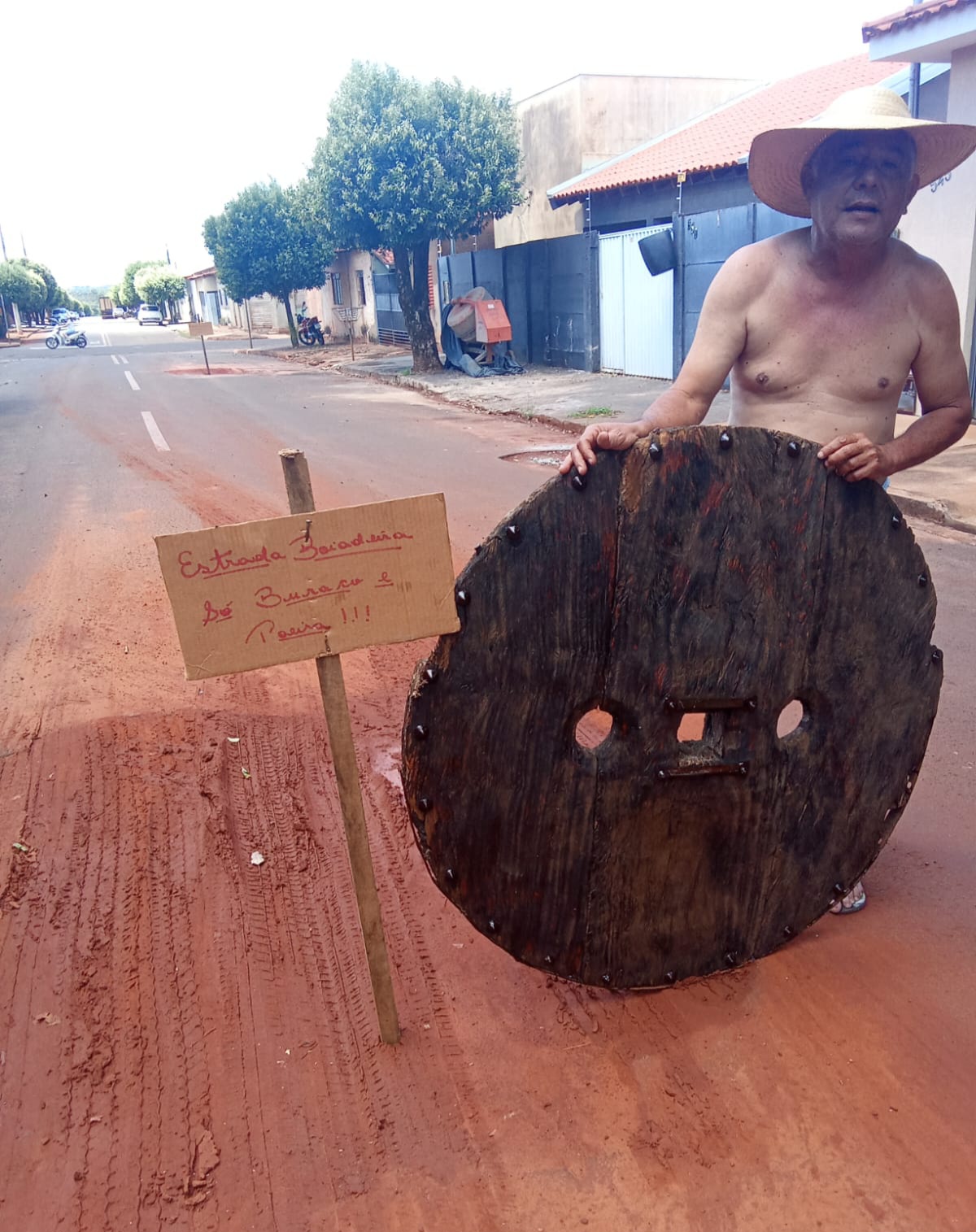 E ele resolveu transformar a sua indignação em protesto bem-humorado ao usar uma roda de madeira de um antigo carro de bois junto com uma plaquinha de papelão com a frase “estrada boiadeira, só buraco e poeira”.