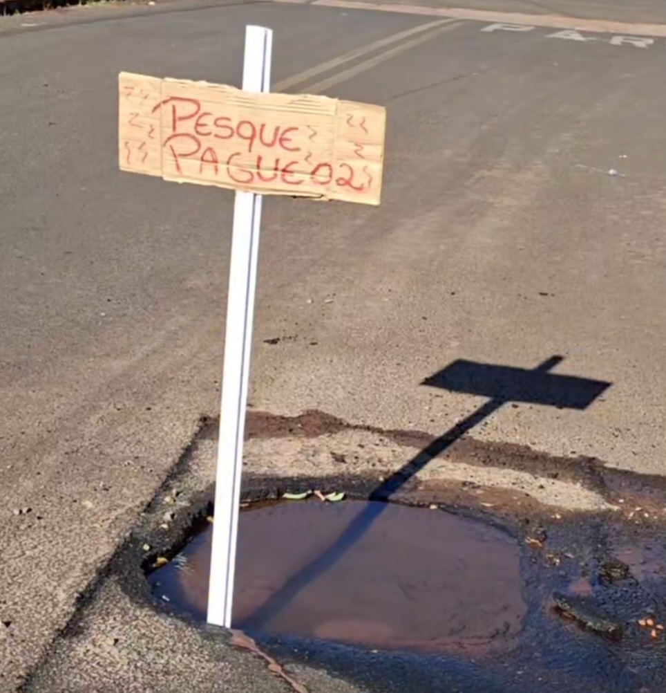 Cansado de esperar pelo serviço de conserto por parte da Prefeitura de Cassilândia, um morador da Rua Manoel da Silva Castro, altura do número 569, na Vila Pernambuco, batizou dois vazamentos de água de “Pesque Pague Freitas” e de “Pesque Pague 2”.