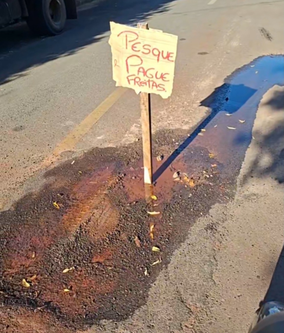 Cansado de esperar pelo serviço de conserto por parte da Prefeitura de Cassilândia, um morador da Rua Manoel da Silva Castro, altura do número 569, na Vila Pernambuco, batizou dois vazamentos de água de “Pesque Pague Freitas” e de “Pesque Pague 2”.