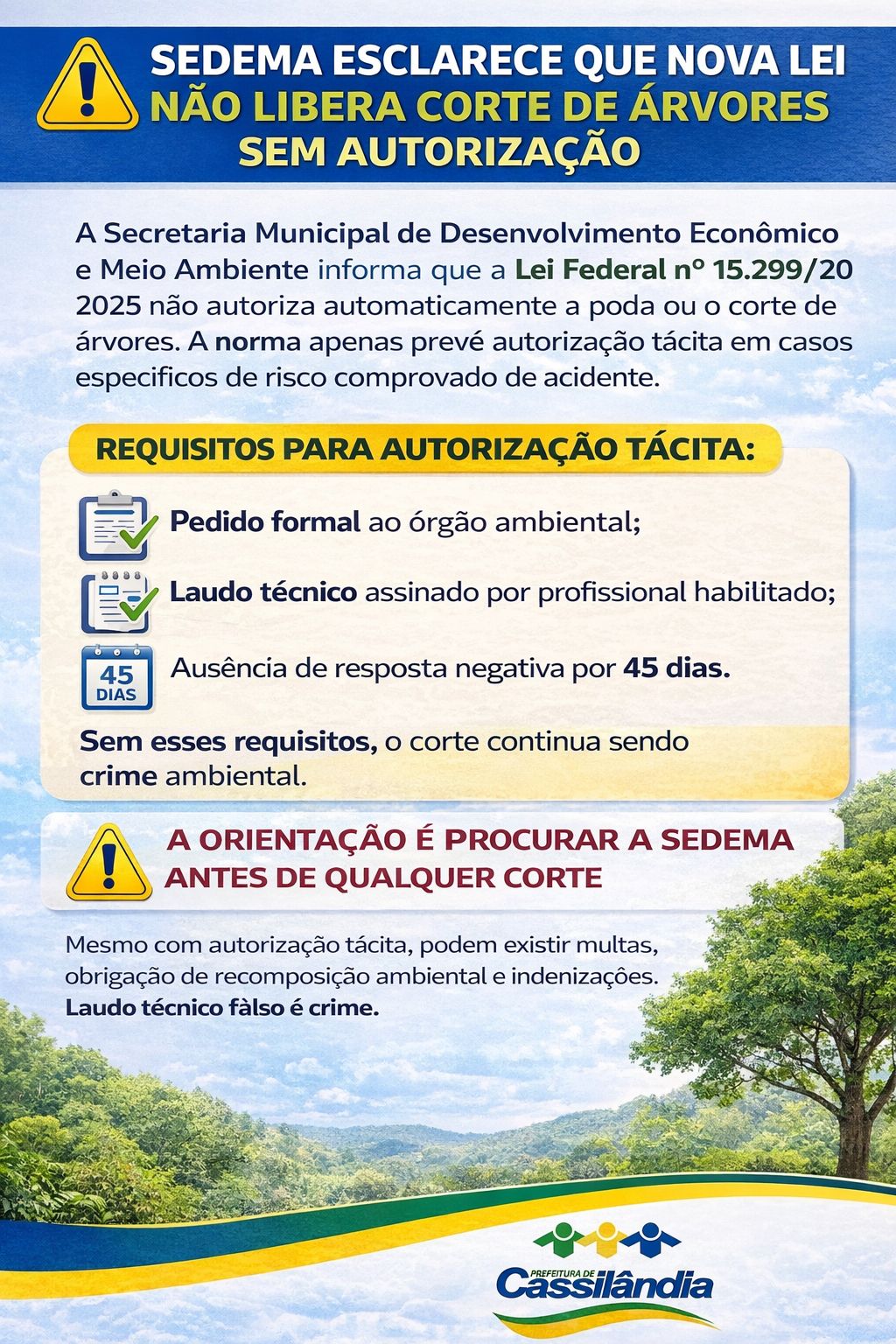 A Secretaria Municipal de Desenvolvimento Econômico e Meio Ambiente (Sedema) informa que a Lei Federal nº 15.299/2025 não autoriza automaticamente a poda ou o corte de árvores. A norma apenas prevê autorização tácita em casos específicos de risco comprovado de acidente, desde que haja pedido formal ao órgão ambiental, laudo técnico assinado por profissional habilitado e ausência de resposta negativa no prazo de até 45 dias.