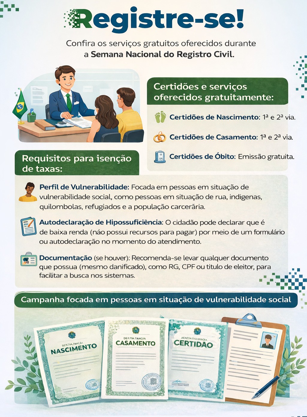 A 4ª Semana Nacional do Registro Civil – Registre-se! está sendo realizada de 13 a 17 de abril de 2026, em todos os estados e no Distrito Federal, mobilizando registradores e demais órgãos públicos de todo o país.