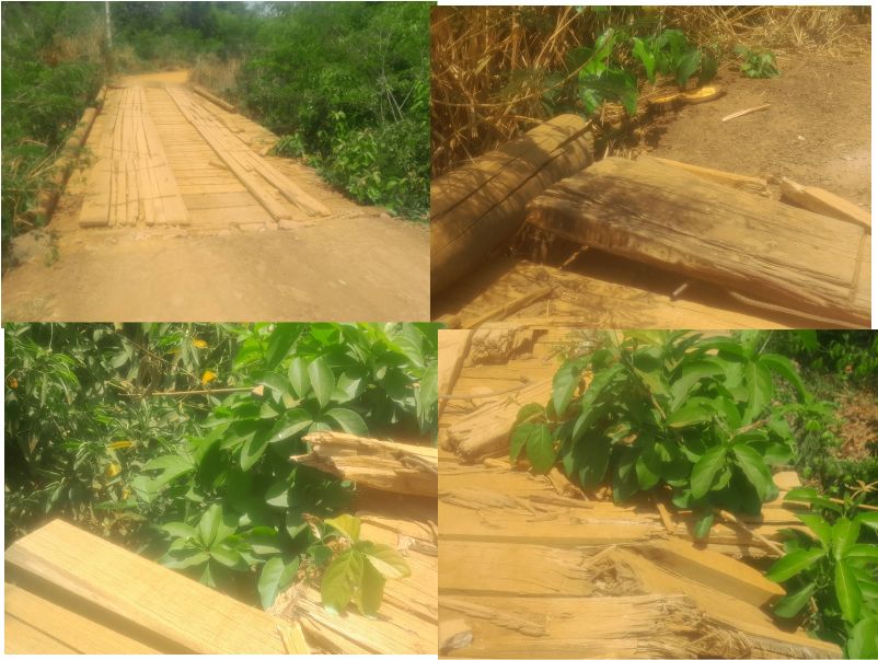 Constatamos que a estrada está bem cascalhada e transitável, mas também verificamos problemas na ponte de madeira que não tem a proteção lateral e está bastante danificada com tábuas quebradas e apresentando algumas irregularidades que comprometem o tráfego de veículos.