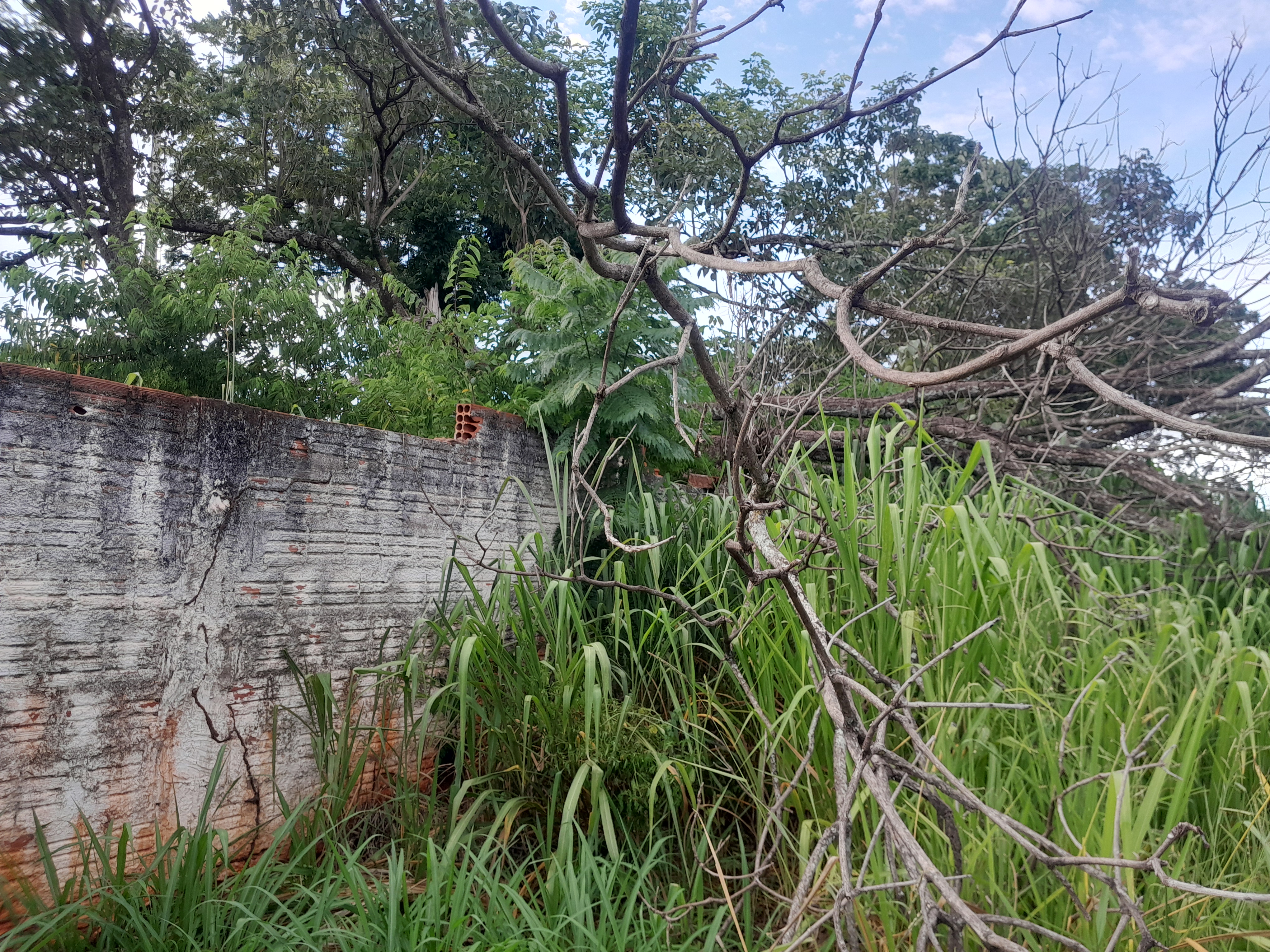 Uma árvore caiu sobre o muro, comprometendo a sua estrutura.
