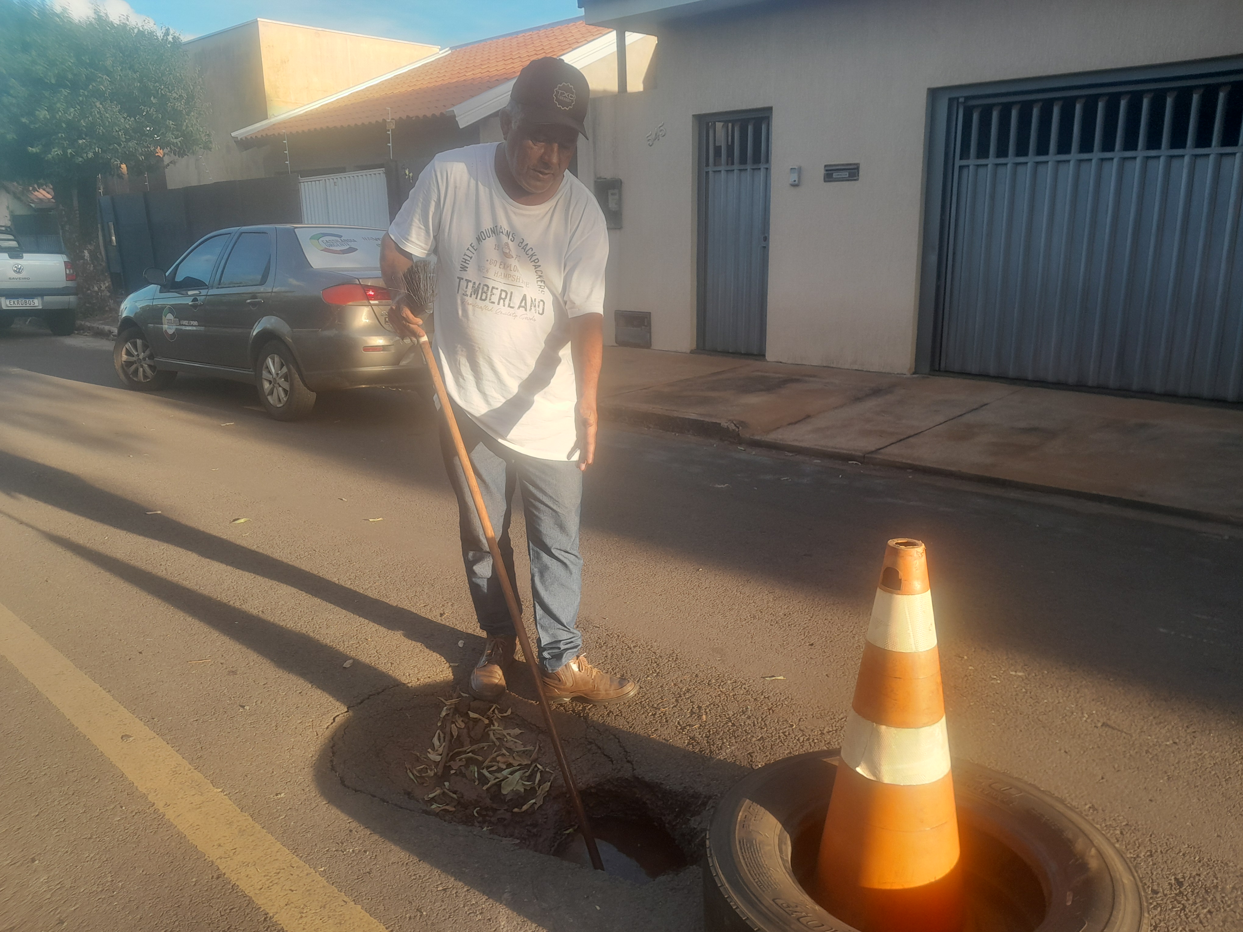 O comerciante Marco Aurélio da Silva Freitas, da Adega do Marquinho, preocupado com possíveis acidentes, sinalizou por conta própria com pneu e cone, um buraco profundo provocado por vazamento de água na Rua Manoel da Silva Castro, em frente o número 569, na Vila Pernambuco, em Cassilândia.