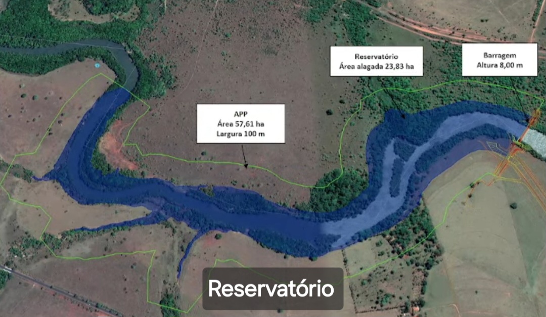 Segundo a apresentação, está previsto a construção de um canal de adução com 3.164,70 m de extensão paralelo a margem direita do Rio Aporé, onde a vazão natural do Rio Aporé será totalmente alterada, essa alteração ocupará um trecho de cerca de 5.5 km a jusante do Rio. Imagine essa vazão reduzida para 17,42 m3/s, cerca de 17.420 litros por segundos. Já a área projetada para reservatório dessa PCH irá ocupar uma área de cerca de 39,99 hectares de matas ciliares, veredas, com ocupação de cerca de 3 km de faixa marginal a montante do Rio Aporé. Nessa região, muitos habitats naturais de aves, a exemplo de araras, tucanos, entre outros, animais silvestres diversos serão totalmente inundados, sem falar que do lado do Aporé/GO existe uma Área de Soltura de Aves, que sequer foi mencionada nos estudos do Rima, e a mesma será impactado diretamente, pois cerca de 300 metros acima, está prevista a construção do Eixo do Barramento da PCH.