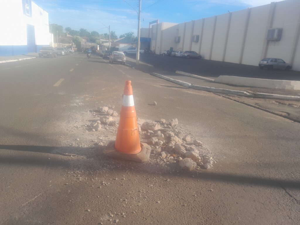 Outro é um monte de pedras e restos de construção de um serviço pela Prefeitura de Cassilândia na esquina da Rua Isaias Teixeira Borges, perto da entrada do estacionamento do Supermercado Rezende, um dos pontos mais movimentados da cidade.