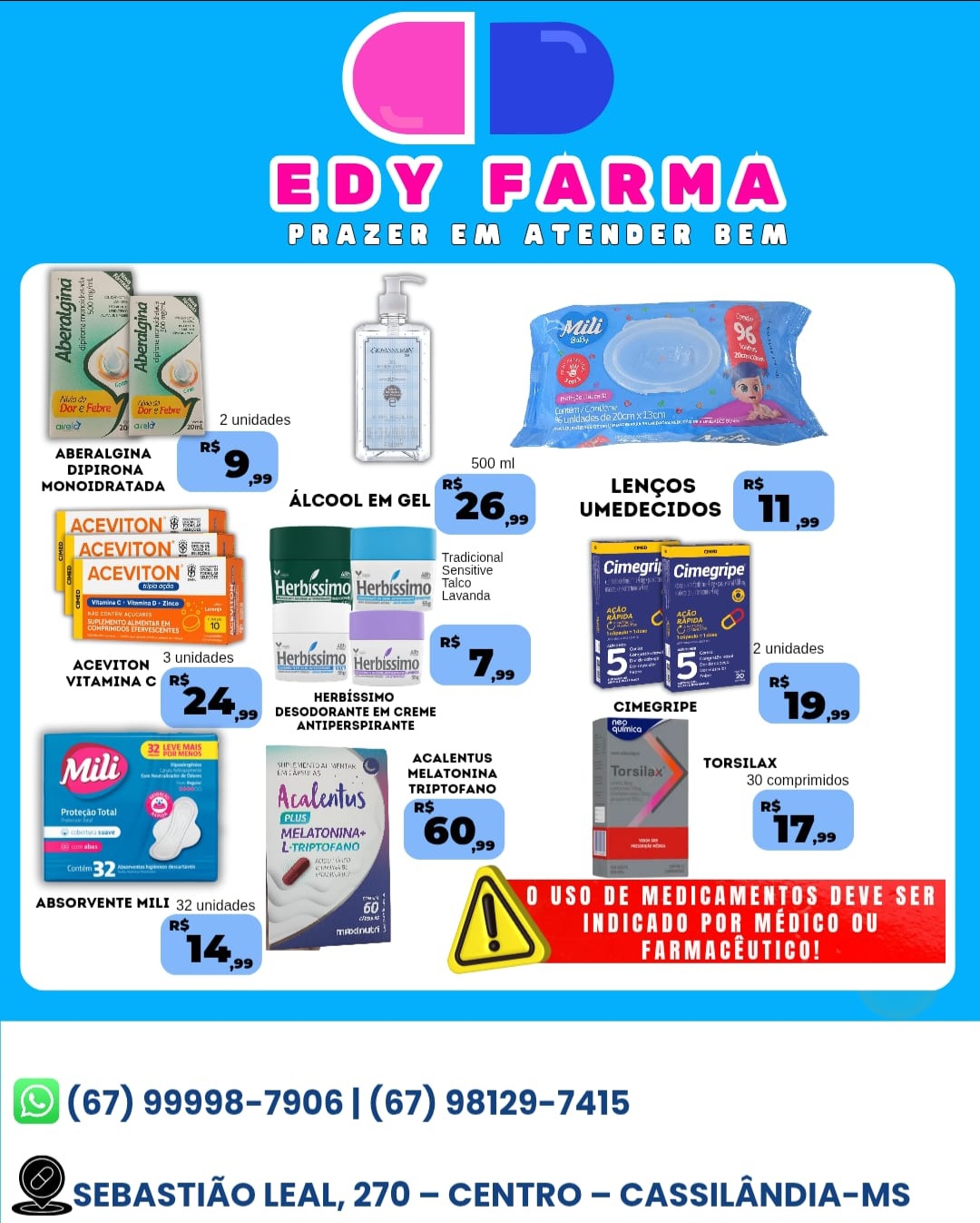 EDYFARMA DROGARIA – Rua Sebastião Leal, 270 – Cassilândia – MS – (67) 98129-7415 / (67) 99998-7906 – Clique aqui para ver o anúncio