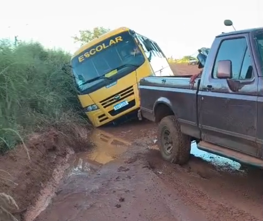 Uma moradora da zona rural de Cassilândia enviou imagens neste domingo, 29 de março, de um ônibus escolar da rede municipal de ensino atolado na estrada do Morro da Mangava, em Cassilândia.